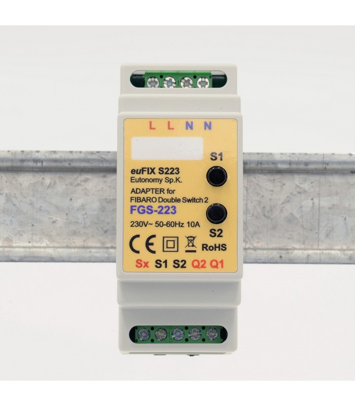 L'adaptateur euFIX S223 est utilisé pour installer le module Fibaro® Double Switch FGS-223 sur un rail de type DIN TH35 dans le tableau électrique.